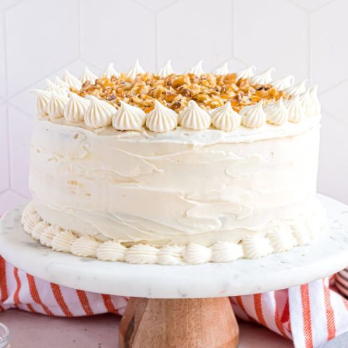 - Frost the entire cake with remaining frosting. Top with chopped pecans and drizzle with caramel sauce. Keep refrigerated until ready to serve. Let sit for 15 minutes before slicing to enjoy.
