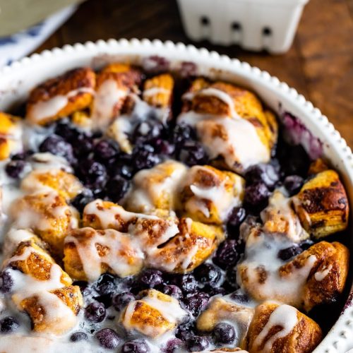 Once the glaze has set slightly, you can cut the blueberry cinnamon bake into squares. It’s absolutely delicious served warm, especially with a scoop of vanilla ice cream or a dollop of whipped cream. It also holds up beautifully at room temperature for snacking later in the day or for breakfast the next morning.