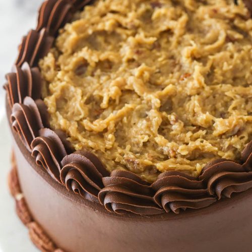 And there you have it! Your beautiful German Chocolate Cake is ready to be admired. For the cleanest slices, I like to use a sharp knife that’s been dipped in hot water and then wiped dry. Slice it up and serve. This cake is wonderful at room temperature, but some people even like it slightly chilled. The contrast between the rich chocolate cake and the sweet, gooey topping is just divine.