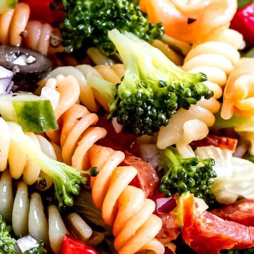 - In a large bowl combine the sliced cucumber, red bell pepper, olives, onion and pepperoni. Add in the pasta and broccoli and stir to combine. Pour in the dressing and toss to coat.