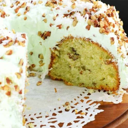This Watergate Bundt Cake is moist and nutty with pistachio pudding and pecans, topped with a light whipped cream frosting and shredded coconut. Perfect for a delicious dessert.
