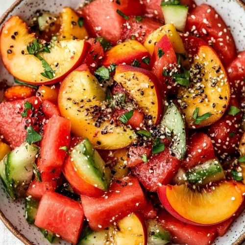 I truly hope you give this Peach Watermelon Salad a try. It’s one of those recipes that just brings a smile to my face every time I make it, and more importantly, every time I eat it. It’s a testament to how simple, fresh ingredients can create something truly spectacular without much effort. It’s the perfect antidote to a hot day, a vibrant addition to any meal, and honestly, just a pure joy to eat. If you love this kind of light, refreshing fruit combination, you might also enjoy my Strawberry Basil Bruschetta or my Grilled Pineapple Skewers with Coconut Drizzle for more summer flavor inspiration. I can’t wait to hear what you think! Please leave a comment below and let me know how your Peach Watermelon Salad turned out, or share any fun variations you tried. Happy summer eating!