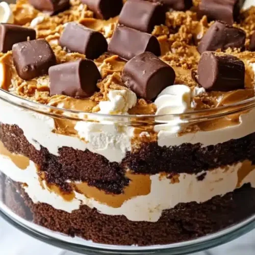 Once your brownies have cooled slightly, cut them into bite-sized cubes. In your clear trifle dish (a large glass bowl works perfectly!), start by layering a generous amount of brownie cubes at the bottom. Spoon a layer of the peanut butter filling over the brownies, then spread a layer of whipped cream. Repeat these layers until you’ve used up all your ingredients, ending with a beautiful swirl of whipped cream on top. I like to reserve some chopped peanut butter cups or chocolate shavings for the very top for garnish.