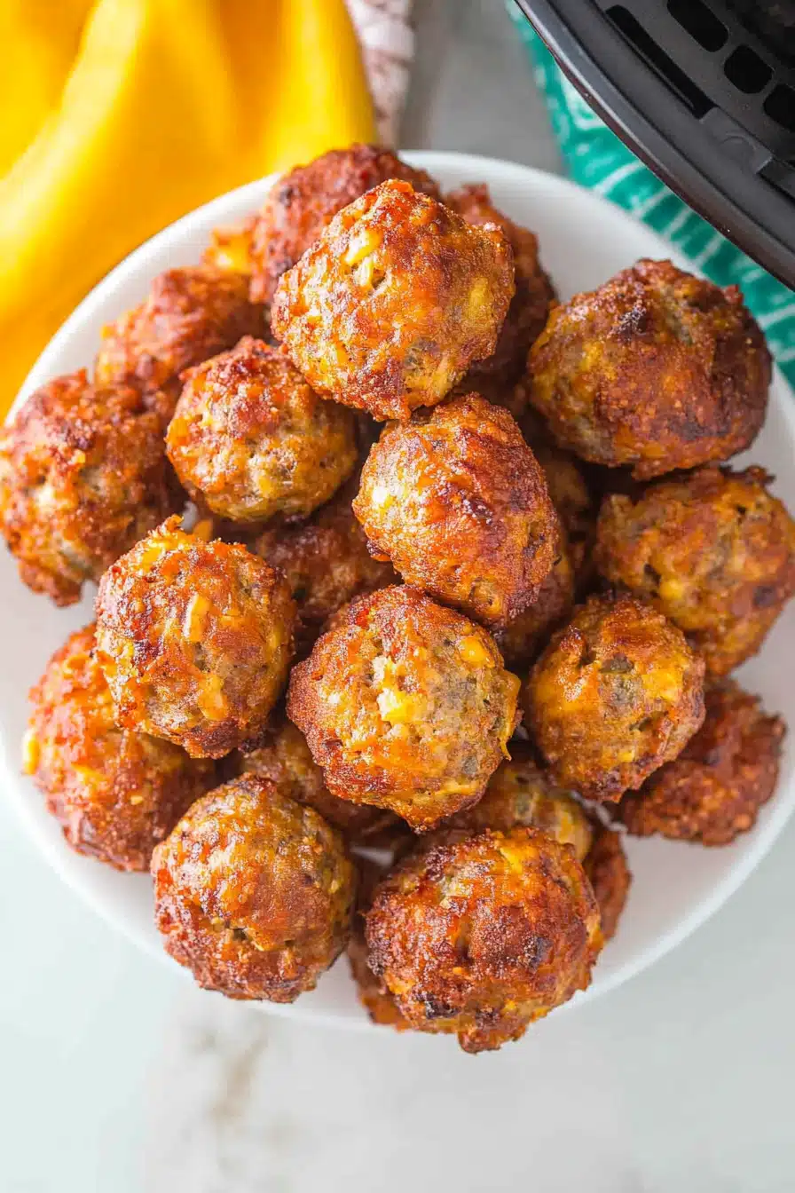 Reheating Methods: You can reheat the sausage balls in the microwave, oven, or Air Fryer. For the microwave, heat them in 30-second intervals until they are warmed through. For the oven, bake them at 350°F (175°C) for about 10-15 minutes, or until they are heated through. For the air fryer, cook them at 350°F (175°C) for about 5-7 minutes, or until they are heated through.
