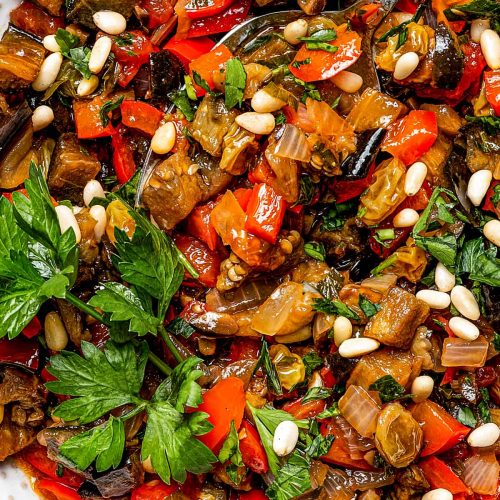 This authentic Caponata combines tender roasted eggplant, sweet tomatoes, savory olives, and plump golden raisins in a tangy red wine vinegar sauce. A perfect Mediterranean appetizer or side dish!