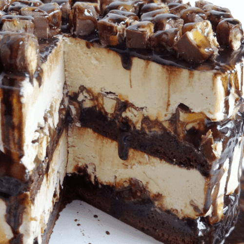 - Freeze & finish: Cover pan and freeze completely—at least 6–8 hours, preferably overnight. When firm, remove from pan using parchment handles, peel off side paper, and transfer to a platter. Drizzle extra caramel and chocolate down the sides, then sprinkle remaining Snickers and a final touch of sauces on top.