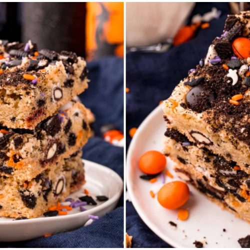 - Spread the cookie dough evenly in the prepared pan and top with remaining M&Ms, Oreos, and Halloween sprinkles.