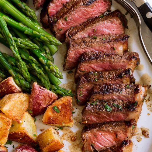 Slice your steak against the grain for maximum tenderness. Drizzle with any resting juices if you like, and serve immediately!