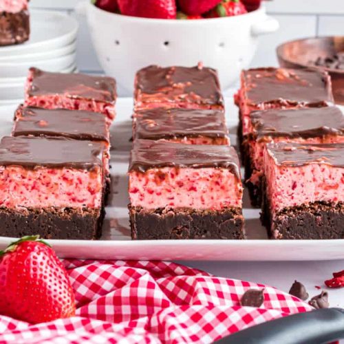 Once everything is cooled and the glaze is set, use the parchment paper overhang to lift the brownies out of the pan. Place them on a cutting board. For the cleanest slices, use a sharp knife and wipe it clean between each cut. Slice them into squares, and behold your beautiful strawberry brownies! They’re delicious served at room temperature, or you can even gently warm them up for a few seconds in the microwave for an extra decadent treat. You can also serve them with a scoop of vanilla Ice Cream or a dollop of whipped cream.