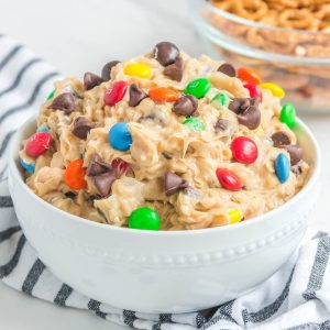 - When ready to serve, transfer to a serving bowl and top with reserved chocolate chips and M&M’s.