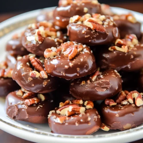 - Dip each caramel cluster into melted chocolate and place back on the sheet. Chill until the coating is firm.