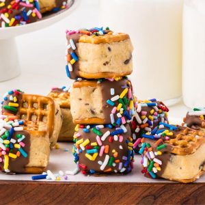 Sweet and salty no-bake treat featuring eggless chocolate chip cookie dough sandwiched between mini pretzels and dipped in milk chocolate.