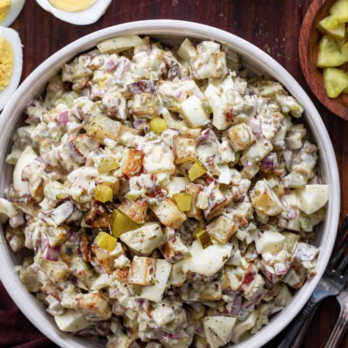 - In a large bowl, combine the roasted potatoes, diced red onion, cooked bacon, chopped hard-boiled eggs, and diced dill pickles.