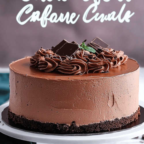 - Once the cake is completely cool, place it on a serving plate. Pour the dark chocolate mousse over the cake, spreading it evenly. Refrigerate for 15-20 minutes until set.