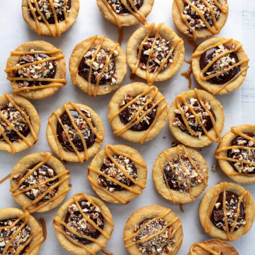 - Once the cookie cups are cool, remove them from the tin. Fill each with 1 tablespoon caramel, 1 tablespoon ganache, and ½ teaspoon chopped pecans. Drizzle extra caramel over the top and sprinkle generously with kosher salt.